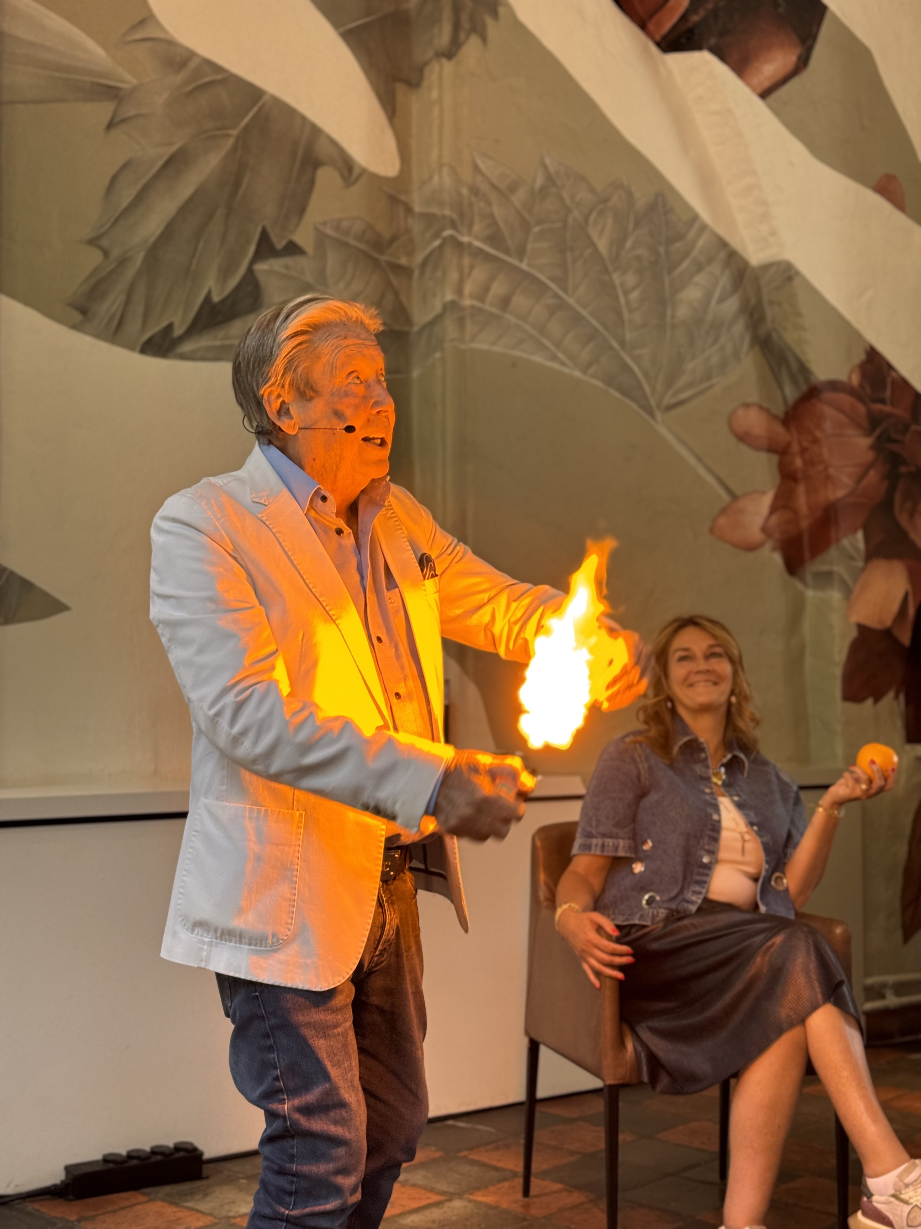 Hans, bekend als illusionist, televisiepersoonlijkheid en spreker, bracht een energiek en persoonlijk verhaal over ondernemerschap, tegenslag en veerkracht. In zijn betoog deelde hij openhartig en met een flinke dosis humor de uitdagingen die hij als ondernemer en publiek figuur heeft meegemaakt, van financiële moeilijkheden tot bittere teleurstellingen.